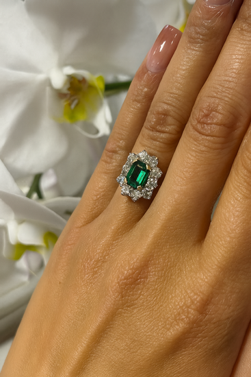 Expertly crafted with elegance and luxury in mind, this 18ct yellow gold cocktail ring showcases a stunning 1.00ct emerald cut natural emerald at its center, surrounded by a beautifully intricate flower design adorned with 1.50ct of sparkling diamonds. Elevate any evening attire with this eye-catching and sophisticated piece.